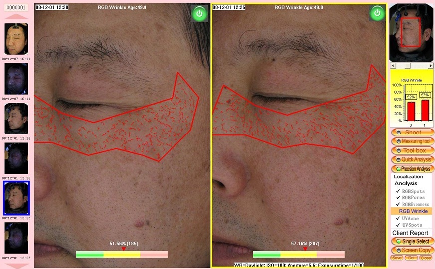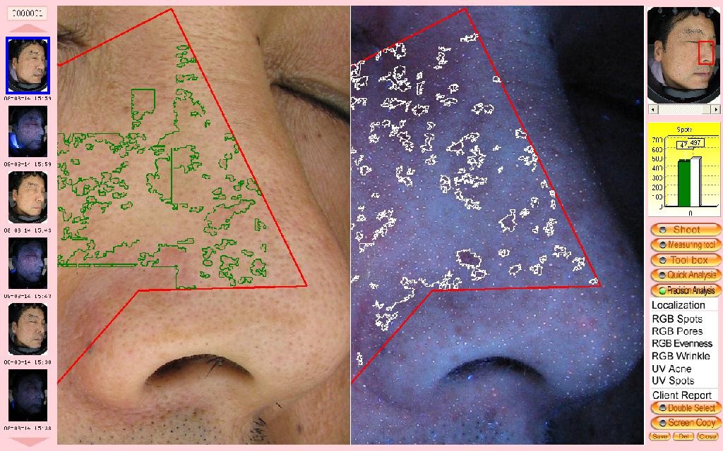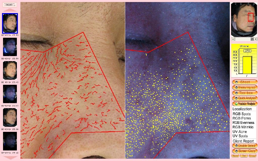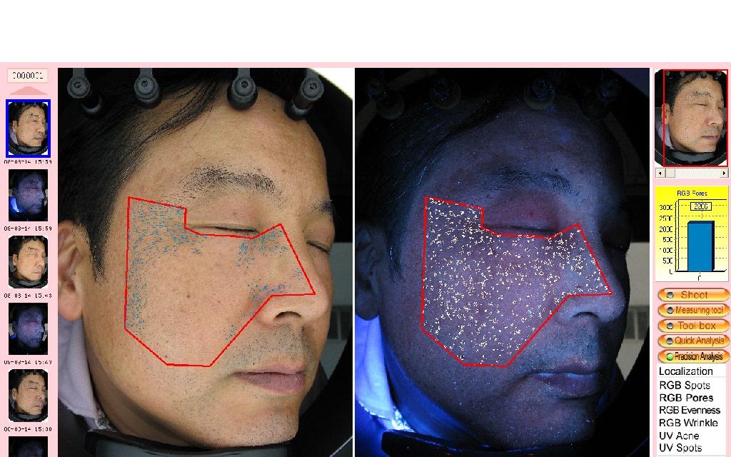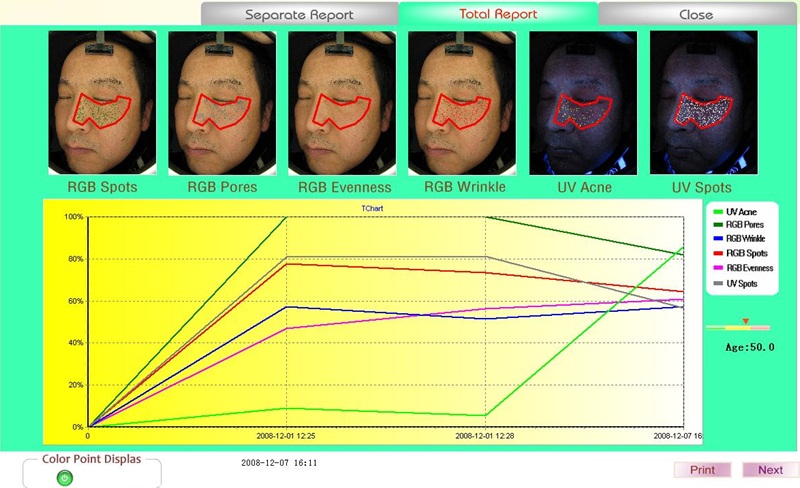 Easily demonstrate whole face skin:  Wrinkles, Spots, Pore, Evenness, Acne and Sun-damage